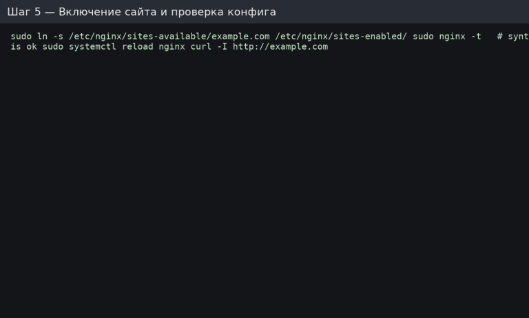 - Конфиг server block записан, nginx -t — OK.