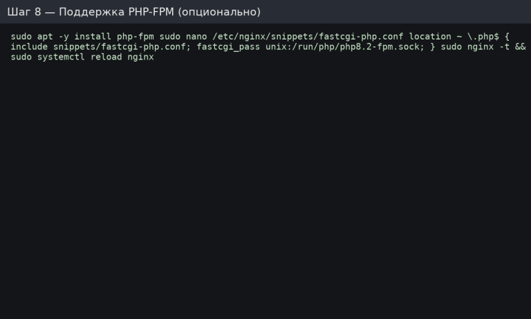 - (Если нужен PHP) — PHP-FPM подключен, info.php удален.